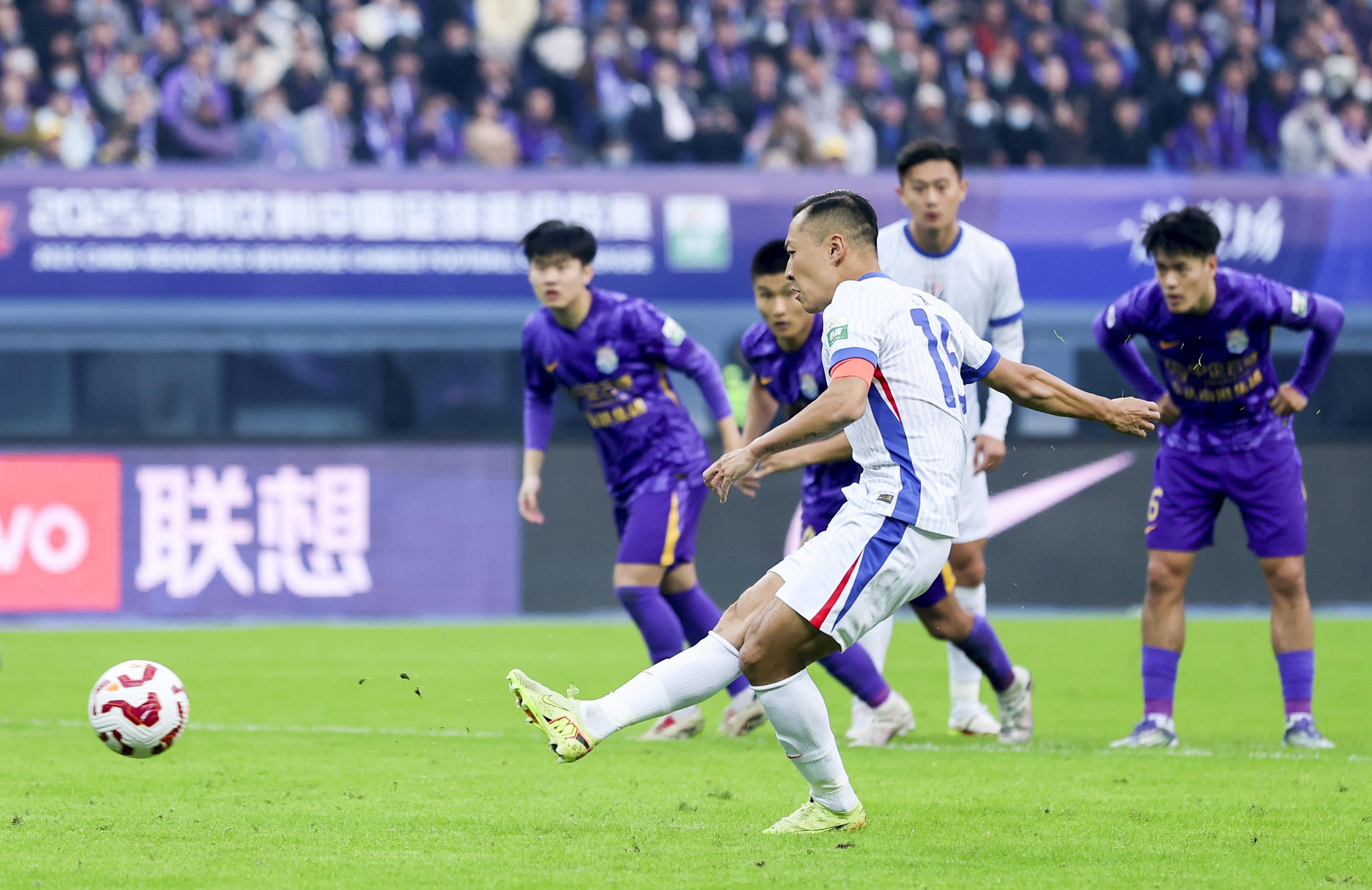 ↑2025年11月22日,上海申花队球员吴曦(前)在中超第30轮点球破门。新华社记者 孙凡越 摄